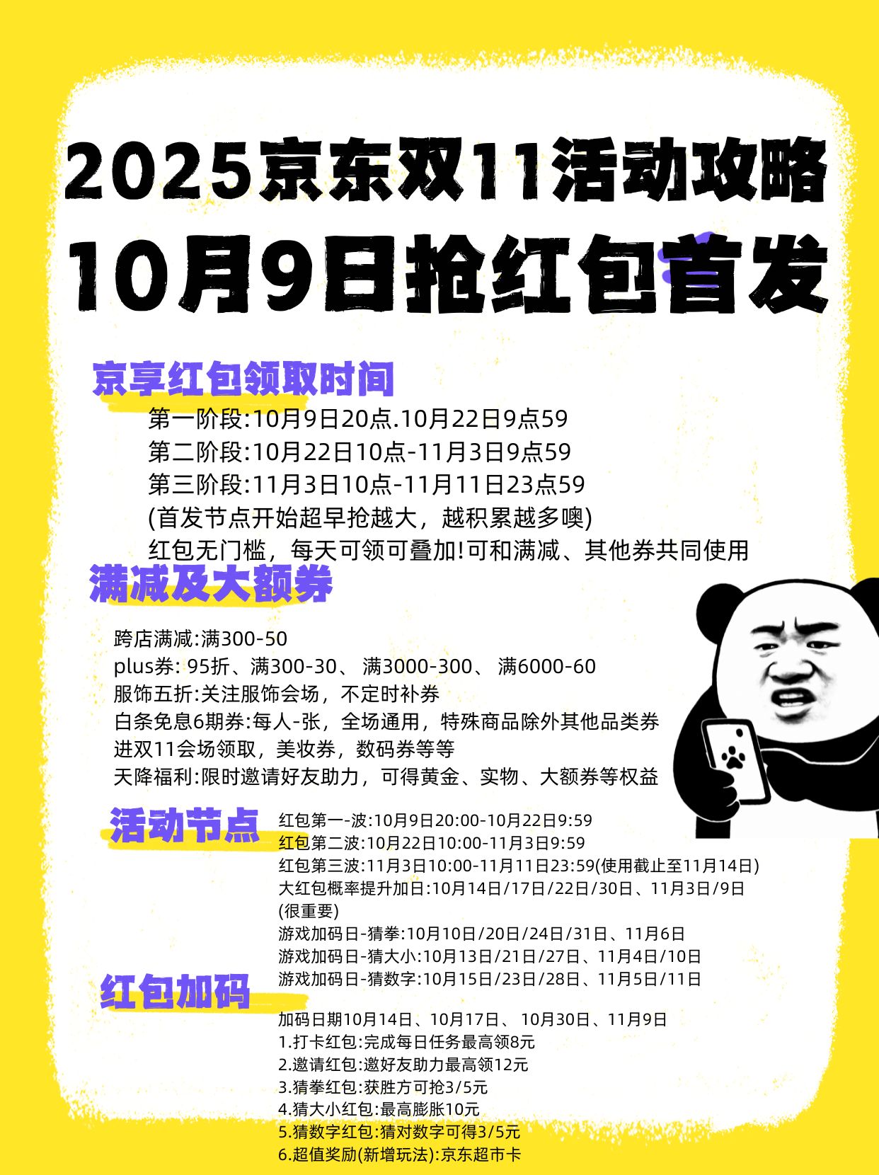 2025京东双十一攻略来了||今年京东双十一于10月9日开启,持续至11月14日,长达37天的活动周期内,“官方直减+跨店满减+红包”为核心优惠组合,玩法更直接。 1、如何领取京享红包 活动期间在京东首页搜索『有惊喜228』可随机获得京东红包、优惠券、京东支付券、京东超市卡,红包面额蕞高11111元 2、活动时间 10月9日 20:00:00-11月14日 23:59:59 3、红包加码节点、概率提升节点 红包奖池加码节点????: 10月14日、10月17日、10月30日、11月9日 猜拳抢红包加码节点????: 10月10日、10月20日、10月24日、10月31日、11月6日 猜大小抢红包加码节点????: 10月13日、10月21日、10月27日、11月4日、11月10日 锦鲤数字红包节点????: 10月15日、10月23日、10月28日、11月5日、11月11日 概率提升???? 10月14日(全天)、10月17日(全天)、10月22日(10点-24点)、10月30日(全天)、11月3日(10点-24点)、11月9日(全天) 4、京东双11活动入口汇总 京享红包:京东搜索【有惊喜228】 家电国补:京东搜索【好运连连400】 数码国补:京东搜索【红包到手335】 苹果大额券:京东搜索【惊喜好物711】 5、省钱小贴士 收藏红包口令,记住红包加码关键时间节点! 宝子们,不妨码住,以便更好地学习和准备哦~