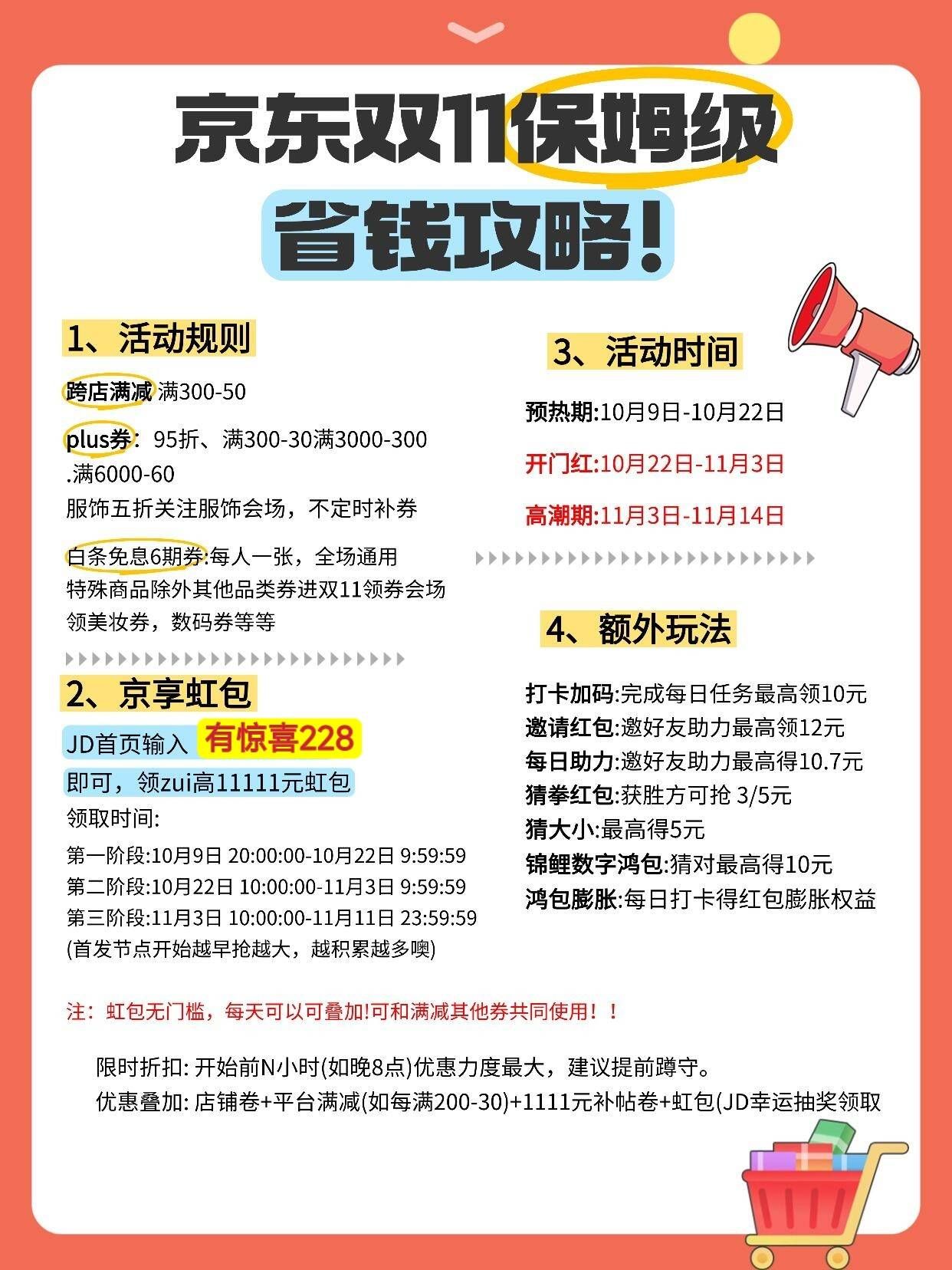 注意活动阶段:活动分为预热期(10月9日0:00 - 19:59)、抢先购(10月9日20:00 - 10月31日)、开门红(10月31日20:00 - 11月3日)、高潮期(11月4日 - 11月11日)、返场期(11月12日 - 11月14日),不同阶段有不同的优惠侧重。