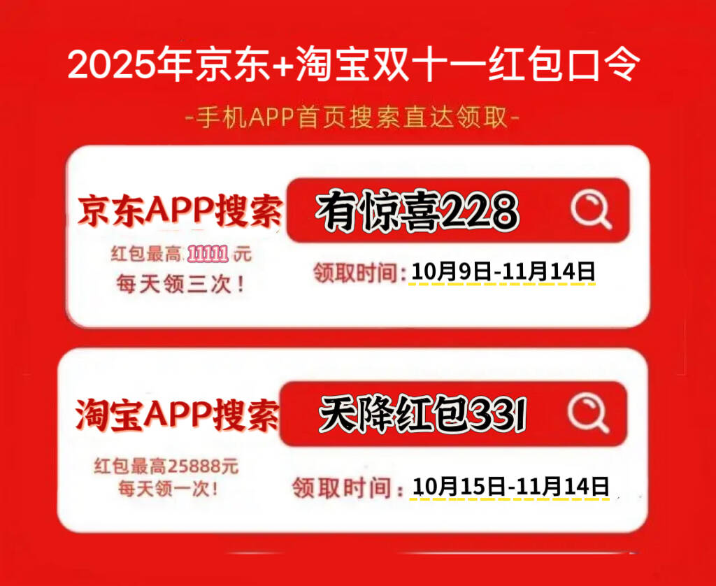 在接下来临近一个月的时间里这37天 2025年京东双十一红包口令是:“有惊喜228”“好运连连400”“红包到手335”红包能天天领,每天可领3次。 2025年天猫淘宝双十一红包口令是:【天降红包331】10月15日开始每天可领。 大家可以尽情享受这场购物狂欢,以更实惠的价格买到心仪的商品。