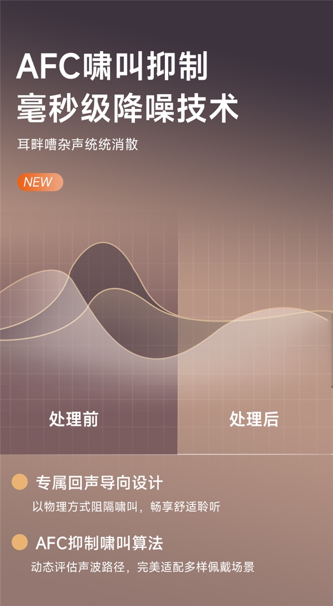 不仅如此,未来客P18还采用近耳式佩戴设计,能让声音的定向传递,精准地收集和保护人声。声音从耳廓附近定向传递至耳道,收声角度控制在30°范围内,有效减少环境噪音的干扰。在嘈杂的餐厅中,听障人与对面的朋友交谈,近耳式的设计能够精准地收集朋友的说话声音,同时抑制周围其他桌的谈话声和环境噪音,让听障人能够专注于对话。 而且,它还能智能识别并优先放大语音频率范围内的声音,保护人声不被其他噪音掩盖。比如在公交车上,听障人周围有发动机噪音和乘客的交谈声,依然能够清晰地传递司机的报站语音、身边人的交谈内容,让听障人听到的声音更加真实自然,体验更好的细腻听感。 【技术破局三】:人声更突出,环境更安静 日常生活中充斥着各种环境噪声,如地铁轰鸣、人群嘈杂声等。传统助听器将它们与人声一并放大,反而导致更听不清。而强大的降噪能力,是决定助听器实际使用效果的关键。 未来客P18采用反向声波抵消技术,结合深度神经网络降噪算法,智能识别并分离人声与环境噪音。助听器的麦克风捕捉到噪音后,迅速产生反向声波将其抵消。例如轰鸣声、风声、碗筷声被有效屏蔽,人声会被精准放大。听障人独自外出,也可以听见车站广播播报的声音,不再因听不清,而错过站点,也不会因听不清别人的话,而手足无措的站在原地成为焦点。并且在听清声音的同时,降噪算法会自动甄别噪音并抑制,不让它们影响听障人的声音传达,就算身处嘈杂的环境之下,也能拉近说话对象的声音,保证对话轻松顺畅。 【技术破局四】:消除干扰噪音,告别“吱吱”尴尬 传统助听器最令人头疼的“啸叫声”,在TC1600-P18身上被彻底解决。它搭载AFC啸叫抑制算法,内置的双麦克风阵列以高频的速度实时捕捉耳道内外的声波并采集。当系统检测到啸叫前兆时,AFC算法会及时的介入,以秒速重新评估一次“麦克风→受话器→鼓膜→麦克风”这条回路的增益余量,自动把接近啸叫临界点的频段压低3–6 dB,而其它频段保持原增益,做到“只压啸叫、不压语音”。并且,对一些“堵耳”行为做出迅速的反应处理,不会出现接触听障人身边时,有“哔——”一样的刺耳尖锐声,在出现意外啸叫时,会瞬间下调8 dB,保护薄弱的听力,同时增强该环境下的语音清晰度,不仅能让听障人完整且清晰的听见声音,还没有话外之音的干预。