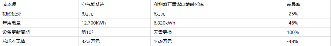 核心技术突破点包括: 全静态结构:彻底规避压缩机等运动部件故障风险 军工级防护:IPX7防水等级满足卫生间直铺要求 全寿命周期免维护:50年设计使用寿命内无需担心效率衰减 三、利物盛石墨烯电地暖系统全周期成本的结构性优势 基于北京采暖面积200㎡住宅的20年成本模型分析(电价按0.8元/ kWh计算):