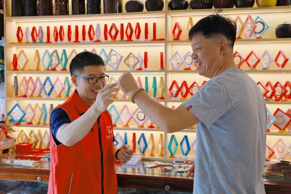 图为天台烟草客户经理向游客介绍文创产品。 陈炉峰看在眼里,急在心里,主动承担起宣传推荐的重任。他向游客详细讲述手串的来历、特点和寓意,吸引了不少游客的目光。这让原本“养在深闺人未识”的手串逐渐被更多游客认可和喜爱,不仅直接增加了店铺的营业收入,更让深具天台文化印记的产品,随着游客的脚步走向四面八方。 从“线下火”到“线上爆” 线下推荐点燃了消费热情,天台烟草的服务脚步并未停歇。为让更多游客和无法亲临的消费者了解天台特色,客户经理们顺势而为,将“香溢助农”直播搬进了零售终端,开启了一场山城好物的云端之旅。 镜头前,威磊副食店老板略显腼腆,但在客户经理陈炉峰的引导下,逐渐自信地介绍起五线菩提的来历与寓意。直播间里,高山云雾茶、乌药、笋干等天台土特产轮番亮相,客户经理化身“主播搭档”,用生动语言讲述产品背后的故事,订单从省内蔓延至全国多地。