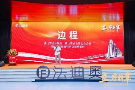 领导致辞 战略定鼎 沈董致欢迎辞 法迪奥新总部基地从2023年3月8日奠基,2025年2月26日竣工验收,历时721天。 新总部的落成,不仅是法迪奥自身发展的需要,更是响应佛山市打造“有家就有佛山造”产业品牌号召的具体行动。