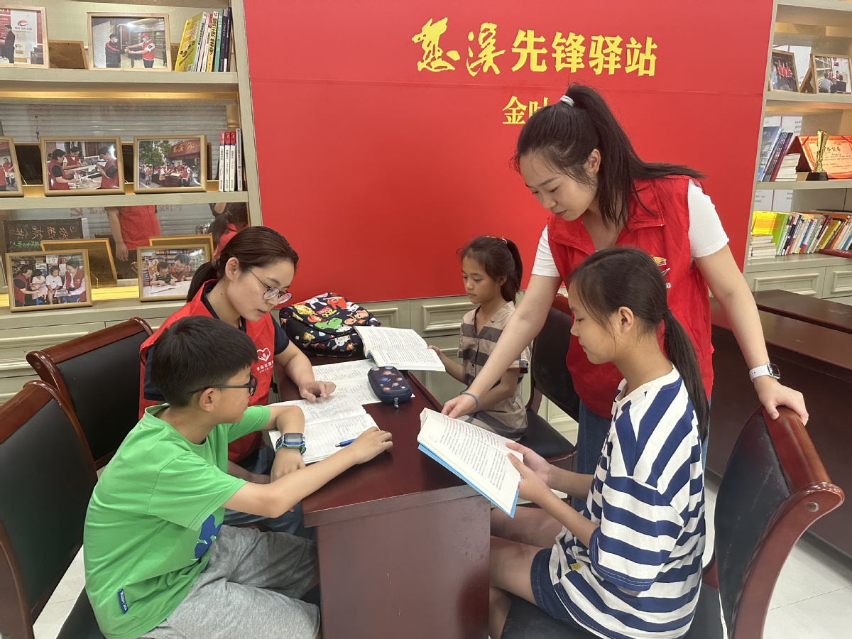 图为丁钰卿(左二)开展暑期助学服务 外来党员零售户陈广川也感慨道:“小丁同志考虑到我们这些外来党员过组织生活的不便,主动召集我们来党员先锋驿站,集中开展理论学习、主题党日活动等,让我们在异乡找到了组织的温暖。” 丁钰卿和她的志愿服务小分队,以慈溪市坎墩五塘新村惠利烟酒店等“香溢红色驿站”香溢红色驿站为阵地,每月定期组织各项公益服务活动,为当地孤寡老人、社会困难群体、户外劳动者等筑起“温暖之家”。义务理发、测量血压、修理电器、政策宣讲、防诈骗宣传等活动开展得有声有色。快递小哥刘建是这里的常客,他说:“这里不仅能歇脚喝水,还能通过"宣讲角"了解最新政策,真是我们的暖心驿站。”