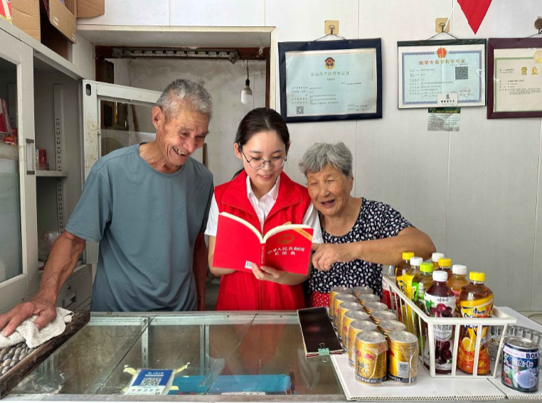 图为丁钰卿为老年零售户进行民法典宣传 辖区内的残疾零售客户陈志明经营小店二十余年,因身体原因守着旧烟柜不愿改变。刚参加工作不久的丁钰卿就把他纳入重点帮扶对象,每次走访时主动陪他拉家常,帮忙整理店铺,还将杂乱的烟柜整理得井井有条。 平日里,她更是常常带领市场部“香溢”志愿服务小分队进行专项帮扶和经营指导,日复一日的真诚付出,时时让陈志明感动不已。 在丁钰卿帮助下,陈志明的小店换上新柜台,安装了数字化店铺管理系统,店貌焕然一新,客流明显增加,利润稳步提升。 陈志明逢人便夸:“小丁不愧是一名共产党员,真正把我们零售户的冷暖放在心里!” 暖心聚力,以行动践行志愿精神 夏日高温季,丁钰卿管理服务区里有不少家有果园的卷烟零售户常常陷入果园管理与店铺经营的两难境地。五十多岁的店主王大哥就在农忙时腿不慎受伤,面对亟待交付的5000斤葡萄一筹莫展。情急之下,他拨通了香溢志愿者丁钰卿的电话。