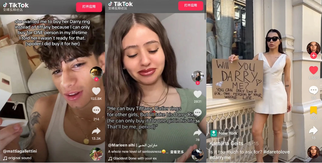 这份共鸣,早已席卷全球。作为全球主流的短视频阵地,TikTok2024年的热搜榜单上出现了DR的身影——它是当时唯一以品牌名称直接登榜的珠宝品牌,其海外热度可见一斑。不仅海外明星红人,如美国真人秀明星Emily、@Francesca Farago、Tiktok网络红人@jcandsondraa等,纷纷以DR见证爱情,年轻群体中更是掀起了一阵“不爱Tiffany爱DR”的风潮。这一趋势甚至延伸至线下,融入街头文化中,“Do you marry me”一度被“Do you darry me”替代。至此,“DR”超越单纯品牌范畴,演变为代表着唯一、承诺与坚定选择的文化符号,成为欧美年轻一代对爱情最高愿景的具象表达。 幸福,是一种最难定义却最易共鸣的「通感」,它可能发生于看到对方因收到钻戒而泛红的眼眶,也可能绽放在意外惊喜那刻的笑容里。当DR始终出现在这些幸福画面中,它便与美好构建起强大的联结——人们凝视的不仅是一枚钻戒,更是背后由数百万对情侣共同验证的、通往幸福终点的可能。