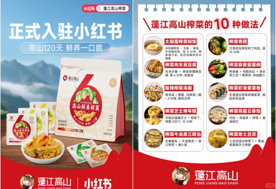 这一布局顺应了消费场景多元化的趋势。除传统佐餐外,榨菜在煲汤、炒菜等烹饪场景的应用占比已达23.7%,为产业增长打开了新空间。为抓住年轻消费群体,蓬江高山榨菜积极布局社交媒体平台。在抖音,蓬江不仅开设了旗舰店,还发布了创意短视频,激发用户自发创作内容;在小红书,官方账号"蓬江高山"发布了10种创意吃法,从"榨菜肉末蒸豆腐"到"榨菜青团",引导用户将榨菜作为创意食材使用,拓宽消费场景。