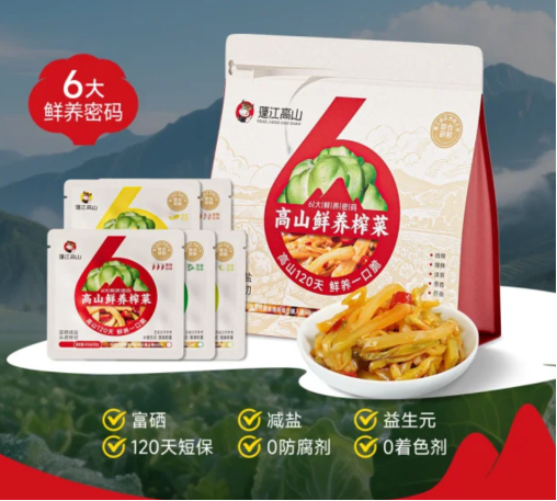 蓬江高山榨菜重磅亮相直播间的背后,是其在产品研发上的重大突破。通过减盐技术创新,产品实现了钠含量从2000mg/100g到1200mg/100g的突破,远超行业平均水平。
