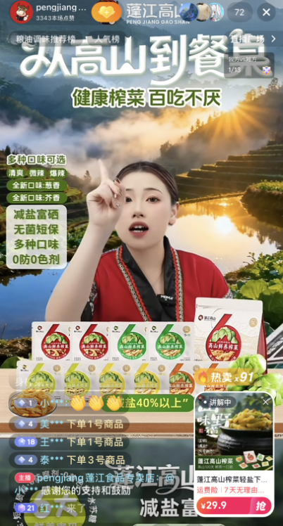 "宝宝们看好了,这是我们蓬江高山榨菜全新的微辣口味,采用减盐工艺,零防腐剂、零着色剂,却能保持120天新鲜如初!"直播间里,身着当地特色民族服装的主播手持新品,面对镜头热情讲解。弹幕区不时飘过"已下单"、"看着就脆爽"的实时互动,直播点赞数迅速突破3343,并在持续攀升。