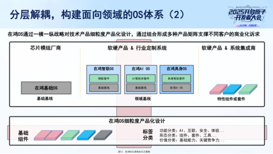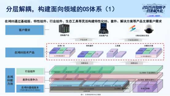 图/在鸿AI OS亮相2025开放原子开发者大会 分层解耦,开源创新 构建“一基多域”的OS产品体系 “一基多域”的实现,不仅需要有着强大能力池作为坚实技术底座,还需要对操作系统架构进行全面创新。在鸿OS以开源鸿蒙社区版为基础,深入融合行业实践经验和理解,在技术架构层面率先采用了分层解耦、积木化搭建的先进架构,该架构将操作系统能力划分为“基础组 — 特性组件 — 行业组件 — 生态工具”等多个层次,并围绕实际业务场景进行全面的能力增强与创新: ● 基础组件:提供系统运行所必需的核心服务与驱动支持。 ● 特性组件:在AI、互联、安全、用户体验等关键领域形成差异化能力,如AI推理引擎、分布式软总线、多因素认证等。 ● 行业组件:针对教育、交通、工业、考试等垂直领域的特定需求,封装了专用的功能模块。 ● 生态工具:提供从开发、调试到测试的全链路工具支持,如模型压缩工具、仿真环境、华为X鸿套件等。