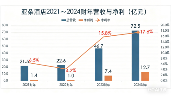 亚朵近几年的经营表现正在被更多产业研究机构纳入观察范围。在最新一轮行业调研中,多家券商开始从酒店管理、供应链与消费品等多维度交叉分析亚朵的增长结构。这一变化的背后,是亚朵在酒店管理与零售业务上的同步扩张,使其逐渐成为跨消费场景的复合型案例。 过去数年,亚朵的财务表现呈现出典型的拐点式变化。2021—2022 年,营收维持在 20 亿元区间、净利率约 5%。到了 2023 年,收入跃升至 46.7 亿元,2024 年进一步达到 72.5 亿元;2025 年前三季度仍保持29.8%、37.4%、38.4% 的同比增速。这一变化让“2023 年发生了什么”成为行业讨论的核心。