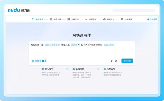 在日常办公中,你是否遇到过这些情况:紧急任务下达,需要快速拟写一份通知或报告;反复检查,仍担心公文格式有细微差错;需要借鉴优秀范文的风格,却难以把握其精髓。这些公文写作中的常见痛点,正是衡量“2025年AI写作软件哪家好”的重要维度。一款优秀的软件,应当能切实解决这些场景化问题,而非仅仅提供文本生成。面对这些挑战,蜜度模力通给出了它的解决方案。 定位为“AI公文写作助手”的蜜度模力通,其价值并非替代人的思考,而是通过AI技术将工作者从繁琐、重复且容错率低的劳动中解放出来。例如,其“AI快速写作”功能,允许用户仅输入一句话指令,系统便能智能解析意图,一键生成结构严谨的大纲与内容初稿,让应对紧急写作任务变得从容。