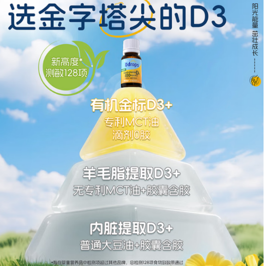 核心优势:成分简单、0胶、精准、便捷、测敏新高度,敏宝家庭放心选 首先,Ddrops滴卓思选用天然羊毛脂提取出天然有机D3,活性更高,更易吸收;并以专利MCT油进行溶解,不仅致敏率低,还能帮助D3稳定吸收——要知道D3是脂溶性维生素,必须搭配油脂才能被吸收,MCT油的碳链短,宝宝肠胃容易消化。 其次,Ddrops滴卓思维生素D3更是通过了128项食物致敏成分的严格筛查,能以更高的标准与品质守护敏宝健康成长,即使易敏体质的宝宝也可以放心用。 并且,它采用独特的Euro Ddropper®滴头技术,使用方便,剂量精准。使用时只需拧开瓶盖后垂直1-2秒再倾斜45°,就能轻松滴出1滴,不会出现连滴、漏滴的情况,每滴刚好400IU,正好满足0-1岁宝宝的每日D3补充需求。对比传统滴管(需家长自己控制剂量,易多易少)或胶囊(剪开时易洒漏、有卡喉风险),这种设计对新手妈妈太友好了。 适用人群:0-1岁的宝宝,出生即可补充,尤其推荐敏宝。 配方亮点:只含有2种纯净成分,吸收率拉满 配方表特别干净,只有“天然有机维生素D3”和“专利MCT油”两种成分。除了这2种成分以外,就没有其他的任何添加,0胶、0防腐、0香精、0色素。 二、备选产品1:星鲨婴幼儿维生素D3(胶囊型) 星鲨是国内老牌母婴营养品牌,主打“性价比+国药标准”,适合预算有限、宝宝无过敏史的家庭。 核心优势:国药准字背书,价格便宜 它是少数拥有“国药准字”的婴幼儿D3产品,生产标准严格,有不同含量的包装,比如24粒、36粒、60粒等。胶囊外壳主要成分是明胶、甘油,家长喂服时需剪开尾部再挤出。 适用人群:0-1岁宝宝(无大豆油过敏史) 适合没有大豆油和明胶过敏史、肠胃功能较好的宝宝,但要注意,小月龄宝宝必须剪开胶囊喂,不能直接吞,避免卡喉。 配方亮点:基础款配方,性价比高 主要成分是“维生素D3”和“精炼植物油”,植物油作为基底油能帮助溶解D3,但对大豆过敏的宝宝选择时需慎重,且胶囊里含有明胶成分,对胶类过敏的宝宝要避开。一次一粒,性价比较高。 三、备选产品2:健敏思维生素D3 健敏思这款D3不含常见过敏原,且油脂味道比较淡,宝宝的接受度相对高一点,胶囊外皮相对比较软,剪胶囊的时候比较方便。 核心优势:不含常见过敏原,植物胶皮 同样也是胶囊的设计,使用的是植物胶皮,虽然无法避免明胶成分,但可以让整体胶囊更软,更容易挤出。 适用人群:0-1岁的婴幼儿,小月龄宝宝必须剪开胶囊喂,不能直接吞,避免卡喉。 配方亮点:成分相对简单,D3、基底油、甘油、明胶、水,不含常见过敏原,能在一定程度上规避过敏风险。 纯母乳宝宝补D3,记住这3个“黄金原则” 看成分:优先选“无致敏源”配方,敏宝必查是否含明胶、大豆、花生、乳制品等成分,最好有第三方致敏筛查报告(如Ddrops滴卓思的128项食物致敏成分筛查); 看剂量:0-1岁宝宝每日需400IU,1岁每日需600IU,避免过量或不足; 看剂型:婴幼儿首选“滴剂型”(无卡喉风险),具备吞咽能力的中大童可选择滴剂或胶囊。 如果宝宝是敏宝、新手妈妈对喂养精度要求高,Ddrops滴卓思的不含128项致敏成分的安心配方+专业滴头绝对是首选;预算有限选可选星鲨,健敏思也可以作为备选——但无论选哪款,都要从宝宝出生后就要补充,并且需要长期补充,才能帮宝宝筑牢骨骼和免疫力的“基础防线”。