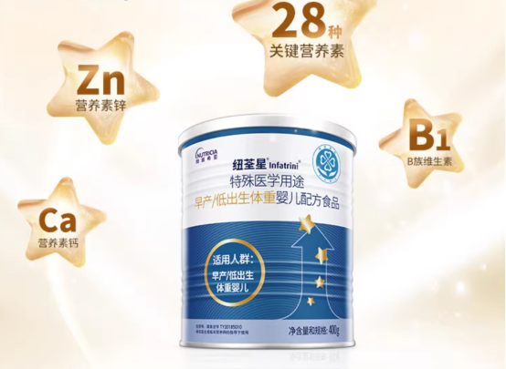 2. 纽迪希亚 纽荃星(Infatrini):院内院外的“全能选手” 这是目前国内市场上非常经典的进口早产儿专用配方,也是很多新生儿重症监护室(NICU)的常备品牌。 核心优势: 超高能量密度。它的标准冲调液能量值高达100kcal/100ml,是普通奶粉的1.5倍,专为极低出生体重儿设计。 适用场景人群: 适合住院期间或刚出院、体重增长极度缓慢、患有先天性心脏病需要高营养支持的极早产/低体重宝宝。 关键配方: 采用了中链甘油三酯(MCT)作为脂肪来源(约16%),MCT不需要胆汁参与就能直接吸收,极大减轻了早产儿未成熟肠道的负担。同时添加了FOS/GOS益生元组合,呵护肠道。 口碑分析: 医生推荐率极高,临床数据扎实。家长反馈其能量足,对于需要严格控制入液量(喝不下太多奶)的宝宝来说,这是最佳选择。