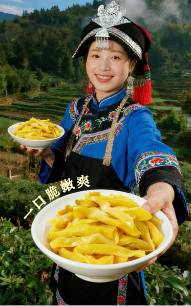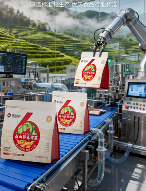 创新的起点,是对原料的极致苛求。其原料来自海拔600米以上的武陵山脉高山生态产区,富硒的土壤与纯净的环境,孕育出肉质更为肥厚、本味清甜的优质青菜头,从源头奠定“鲜”的基础。 真正的革新在于看不见的配方里。蓬江高山与西南大学食品科学学院共同研发的“肽盐复配减钠技术”,巧妙地用部分大豆肽替代食盐,成功将钠含量显著降低。这意味着,在享受咸鲜开胃的传统风味时,身体负担得以减轻。更值得一提的是,蓬江高山的技术突破还实现了在不添加防腐剂、着色剂的情况下,依然能锁住精华,让爽脆口感与鲜醇风味持久留存。