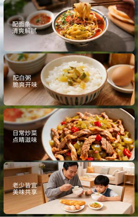 于是,一包全新的蓬江高山榨菜便呈现在眼前:它继承了传统榨菜惹人食欲的咸鲜脆爽,却褪去了过往可能存在的重盐负担与保存焦虑。从清爽原味到微辣、葱香、芥香等多种风味选择,它用一套全新的“鲜养标准”,重新定义了佐餐小菜的价值。当经典国民味穿上“鲜养”的新衣,一段关于美味的新故事,正等待着被每一个“中国胃”重新书写。 榨菜的千面可能:当中国胃遇上创意美食 如果认为榨菜只能配白粥、拌米饭,那可能低估了这包小菜的潜力。在社交媒体上,榨菜正以意想不到的方式,成为创意料理的核心元素,展现出惊人的“社牛”属性。 基础的搭配自不用说:清晨的一碗白粥,配上几缕蓬江高山清爽榨菜,清淡中带着丝丝甜脆,是最经典的中式早餐;午间匆忙的工作餐,微辣口味的榨菜能为简单的面条或米饭注入灵魂;而爆辣口味则是重口味爱好者的福音,无论是夹馒头、卷饼还是直接佐餐,都能带来畅快的味觉体验。