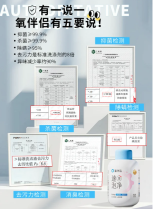 第二推力是体验价值的觉醒,家务越来越需要“情绪正反馈”。当代消费者拒绝将时间消耗在重复、低效的体力劳动上。他们需要的不仅是干净,更是一整套省力、高效甚至带有治愈感的清洁仪式。 活氧产品提供了这种体验升级。无论是浸泡发黄衣物,还是清洁洗衣机槽,用户无需费力搓洗或拆机,只需等待活氧分子完成深度分解工作。看着绵密的气泡咕嘟升起,顽固污渍随之瓦解,这个过程本身就提供了一种“科技治愈”的情绪价值,让家务从负担变为有成就感的智能操作。 第三推力则是环保理念的升级,可持续发展不再是空洞的口号。活氧技术具备天然的环保基因:其作用过程温和,分解产物对环境友好,且高效浓缩的配方减少了包装与运输的浪费。 更重要的是,行业正在向“绿色化”深度转型。政策与市场双轮驱动,绿色功能型日化产品产值占比将有所提升。选择活氧清洁,既是个人健康的选择,也是对可持续未来生活方式的投票。 Part 2:闭眼选购指南:四步锁定真正有效的活氧产品 面对市场上琳琅满目的“活氧”、“氧系”宣称,如何避开营销噱头,选中真材实料?掌握以下四个核心维度,你便能成为明智的决策者。 一看技术核心:认准“过碳酸钠”及优化体系 一切活氧清洁力的基础,都是过碳酸钠(SPC)这一核心成分。查看产品背面成分表,确认其存在是第一步。在此基础上,优质的产品如氧伴侣速泡净会通过复配低温活化剂打造优势,使得产品突破需要热水激活的瓶颈,在50℃甚至更低水温下也能高效释放活性氧,拓宽使用场景。还会针对血渍、汗渍、食物污渍等特殊污渍,加入复合酶,实现靶向分解,提升去渍效率。 二验安全背书:权威认证是最好的“信任状” 真正的安心来自第三方验证。优先选择明确标示以下信息的产品: · 权威检测报告:如CMA、CNAS认证的除菌率、除螨率报告。例如,对氧伴侣速泡净、机槽污溜等产品而言,99.9%以上的除菌率是重要指标。 · 国际标准认证:通过ISO9001(质量管理)、ISO14001(环境管理)等体系认证,表明品牌品控严格。 · 安全承诺:明确标注“无荧光增白剂、无氯漂白剂”等,对于清洗儿童衣物和贴身用品至关重要。