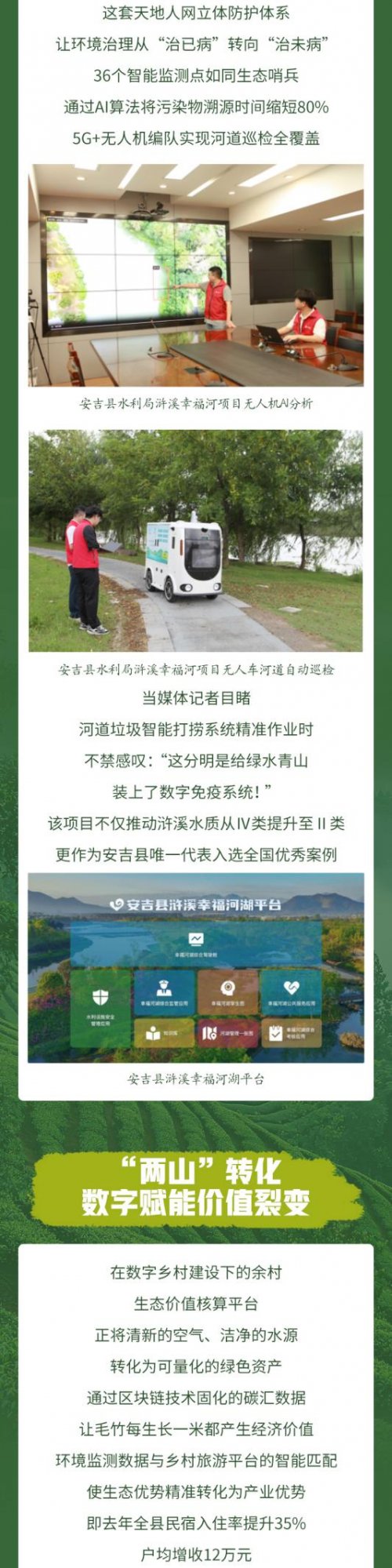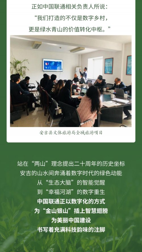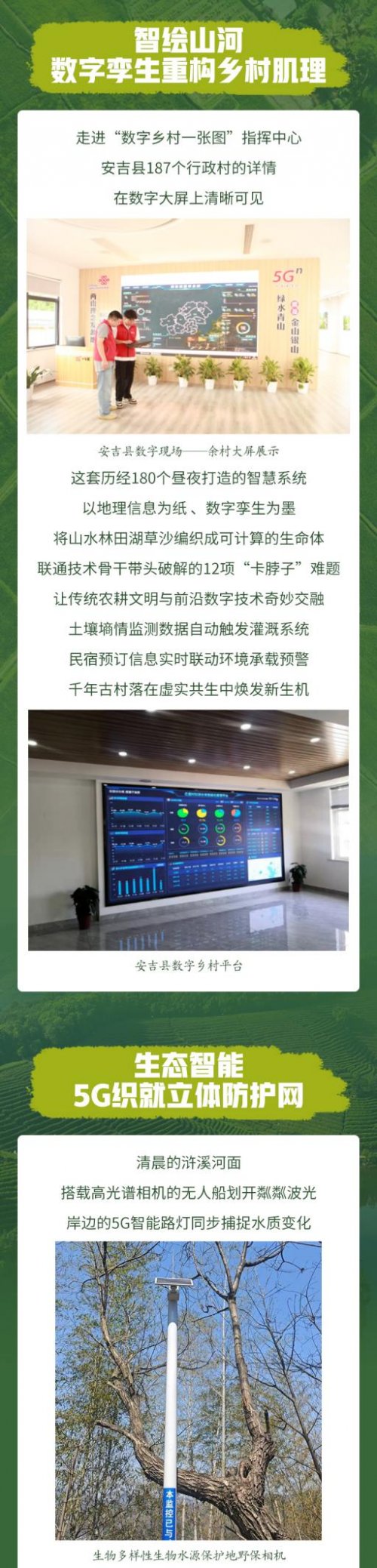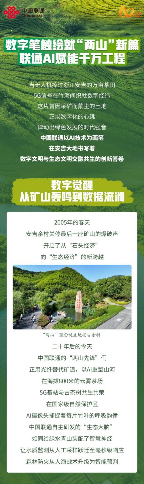 当无人机掠过浙江安吉的万亩茶田,5G信号在竹海间织就数字经纬,这片曾因采矿而蒙尘的土地,正以数字化的心跳律动出绿色发展的时代强音,中国联通以AI技术为画笔,在安吉大地书写着数字文明与生态文明交融共生的创新答卷。