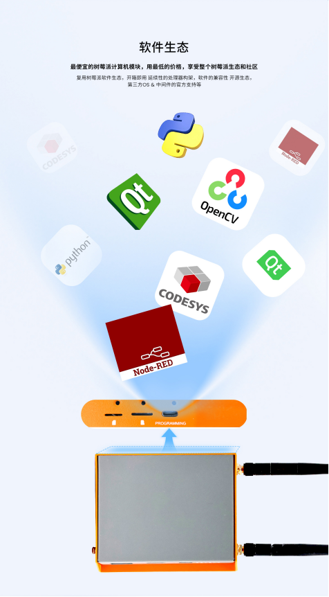 复用树莓派生态,降低工业应用门槛 IPC1100兼容 Raspberry Pi 成熟的软硬件生态,得益于 Raspberry Pi OS,开发者和企业无需进行复杂的 Linux 内核开发,借助树莓派的 Device Tree Overlays(设备树叠加层)机制,像开启特定的接口、或是配置 GPIO 引脚等硬件操作,仅需通过简单的文本配置,即可动态启用或调整各类硬件功能。同时支持CODESYS、Node-RED、OpenCV等主流工具,结合树莓派庞大的开源社区资源,用搭积木的方式快速搭建应用程序。