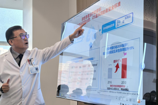 查房围绕一例晚期肺鳞癌病例展开。该患者被诊断为左肺下叶恶性肿瘤,伴有肺内多发转移及多部位淋巴结转移,同时合并高血压、冠心病等基础疾病,病情复杂。 在听取主管医生赵三苗的病例汇报后,参与查房的人员来到患者床旁,王华庆教授亲自进行体格检查,并详细询问了病情进展。检查过程中,患者由衷感谢了以王华庆、姜镕为代表的主任团队,赵三苗、王强、徐蕾等医疗组医生的日常悉心诊治,以及肿瘤一科护士长张园园所带领的护理团队无微不至的照护。他表示,在康汇医院不仅接受了高水平诊疗,更感受到被尊重、被关怀的温暖。 回到示教室,王华庆教授结合有针对性的提问,与治疗团队一起,从病史采集、影像学判读、病理鉴别、分期评估到治疗策略选择,进行了系统梳理与深入讲解。他结合该患者历经多种药物的治疗过程,分析了化疗、靶向治疗、免疫治疗及其联合应用的疗效演变及临床意义,着重指出:肺癌治疗已进入个体化与综合治疗时代,除了传统的手术、放化疗外,免疫治疗、靶向治疗等多种手段需根据患者具体情况进行有序整合。 王华庆教授特别强调了紧随国际前沿研究进展、开展药物临床试验研究对于医院和学科发展的重要意义,并鼓励各专业年轻医生夯实病理生理学基础,提升多学科协作能力。