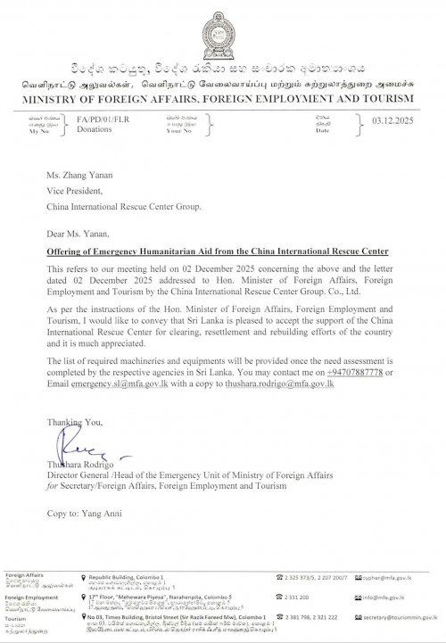 2025年11月28日斯里兰卡发生重大水灾,根据斯里兰卡灾害管理中心最新通报,气旋“迪特瓦”及其引发的连环灾害已造成474人死亡,356人仍然失踪,170万受灾群众。 2025年12月3日,中国国际救援中心(集团)第一时间立即成立了赴斯里兰卡抗洪救灾小组,由中国国际救援中心(集团)海外国际救援协调工作委员会副主席张亚楠代表集团总部,并向斯里兰卡外交部致函表示慰问,斯里兰卡外交部并向中国国际救援中心(集团)发函表示感谢及邀请。12月5日,在中国国际救援中心(集团)统一指挥调度下,第一批救援队伍携带无人机等救援装备和物资,登上了远赴斯里兰卡飞机,开启了第一批援助活动,随后集团从四川、黑龙江等地区抽调精兵强组成第二批救援队伍陆续赶赴斯里兰卡执行紧急救援任务,并同时向斯里兰卡捐献的价值数百万救灾物资将近期陆续运往支援斯里兰卡。