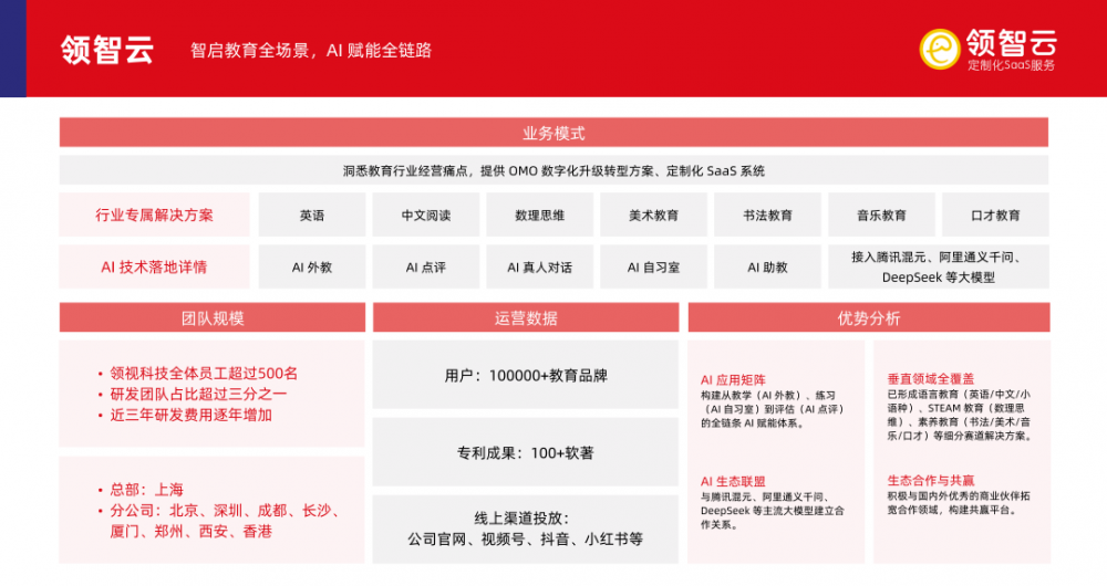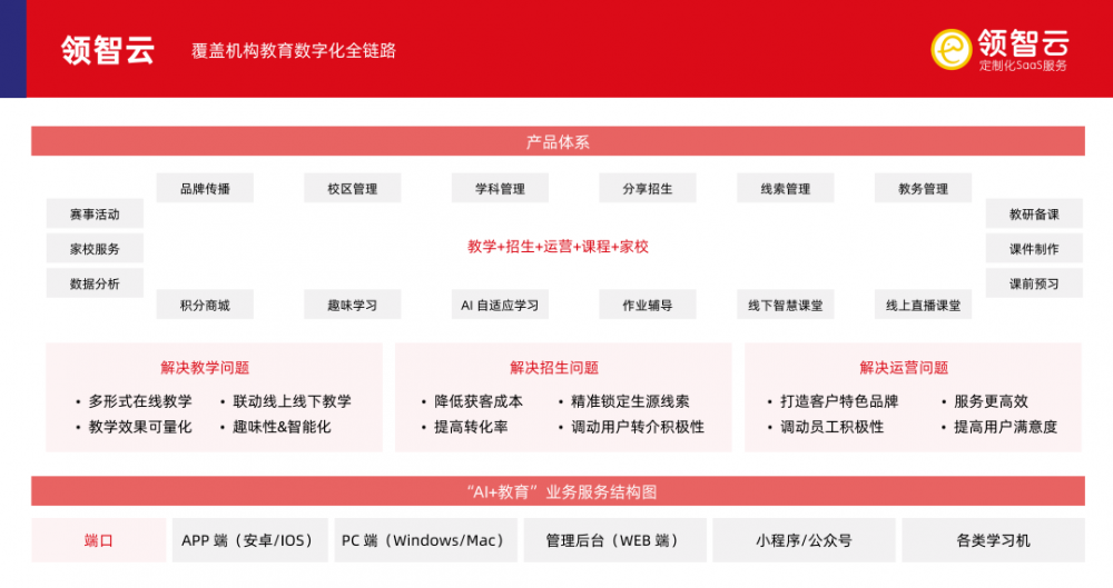 02 领智云 以实践定义AI教育价值 领智云的获奖,源于将前沿AI能力系统性融入教育核心场景,破解了机构在教学质量、运营效率与个性化服务方面的长期难题: 1.全链路数字化赋能基于SaaS平台,为机构提供覆盖“教学-招生-运营-课程-家校”的一站式解决方案,实现运营流程的标准化与数据化,显著降低管理成本,提升运营效率。