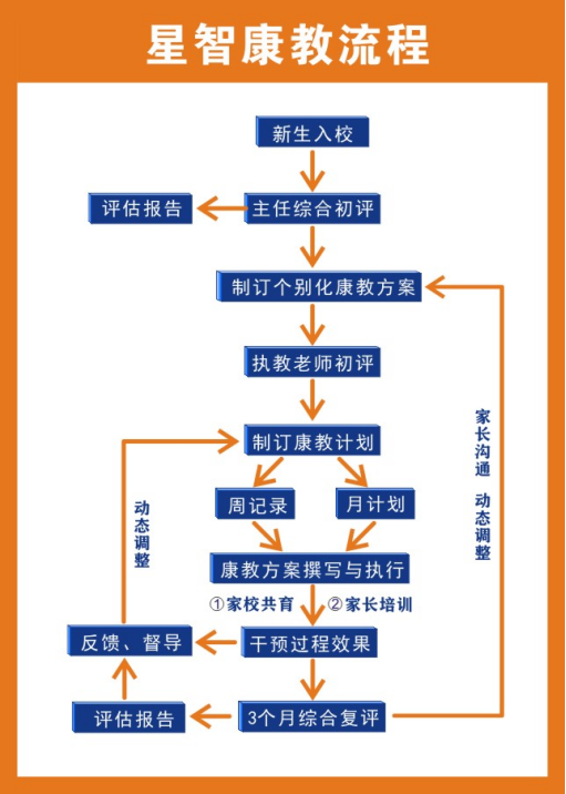 五、闭环式康教流程 康教快速有效 星智成长建立了较为完善的教学研究、质量管控、师资培训、家长培训、康训计划、效果评估等管理服务体系,全面执行制度化、流程化、智能化管理与个性化服务。