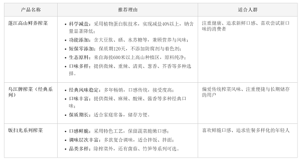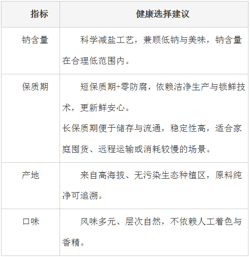指标一:看钠含量——看懂数字,告别“咸菜疙瘩” 曾几何时,榨菜在很多人心中,还是那个重盐咸鲜的“咸菜疙瘩”。如今“减盐”成为趋势,但单纯降低盐分可能牺牲风味。真正的好榨菜,应做到“科学减盐”——在降低钠含量的同时,通过天然调味技术保留鲜脆口感。 通常,我们可以根据每100克榨菜中的钠含量,做一个快速判断: · 传统榨菜:钠含量>1500mg/100g。接近或超过每日钠建议摄入量(约2000mg)的一大半,需谨慎控制食用量。 · 健康减盐:钠含量在700mg-1500mg/100g之间。属于主流改良范围,在风味与减盐间寻求平衡。 真正的技术突破在于“科学减盐”——并非简单减少用盐,而是通过植物蛋白肽等天然技术,在降低钠含量(部分产品可达减盐40%)的同时,激发食材本味,实现“减盐不减鲜”。选购时,请务必查看营养成分表,优先选择钠含量在比较低范围内,且风味标识清晰的产品。 指标二:看保质期——“长短”各有考量,依需选择是关键 保质期长短并非单一的质量标准,而是对应不同的产品定位、工艺与消费需求,应理性看待其各自优势: 长保质期(通常12个月以上):主要依赖成熟稳定的加工工艺与灭菌技术,便于常温储存与家庭囤放,适合追求便利、习惯一次性采购或消耗较慢的消费者。这类产品在风味稳定性和保存适应性上表现突出。 短保质期(通常六个月以内):多与更简洁的配方、更洁净的加工环境及锁鲜技术支持相关。由于减少了对防腐剂的依赖,往往能更好地保留食材的原始口感与营养活性,适合注重“新鲜感”与“清洁标签”、购买频率较高的用户。