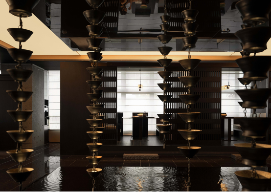 “萨和”一名源自傈僳语中“呼吸”之意,指向一种顺应节律、调和身心的生命状态。这一命名并非概念先行,而是贯穿于酒店空间、服务与体验的整体逻辑之中,也构成了亚朵在高端品牌层面探索差异化路径的重要注脚。 空间叙事:克制中的东方秩序 在空间设计层面,萨和酒店并未选择直观的东方符号堆叠,而是通过更为内敛的方式构建审美体系。整体空间以深色木质、低饱和度色彩为主,辅以石材、布艺与自然肌理,在光线与留白的控制中形成节奏感明确的空间层次。 公共区域采用序列式展开方式,宾客在行走与停留之间,逐步进入更为沉静的环境状态。以茶盏为形态的“听雨”艺术装置,通过水滴与光影的互动,营造出具有冥想意味的感知场景,使空间不再只是功能容器,而成为情绪转换的媒介。 这种设计路径强调的是人与空间的关系,而非空间本身的展示性,与近年来高端酒店从“可被观看”走向“可被体验”的行业趋势相呼应,也体现出亚朵在高端产品上对“体验完整度”的持续投入。