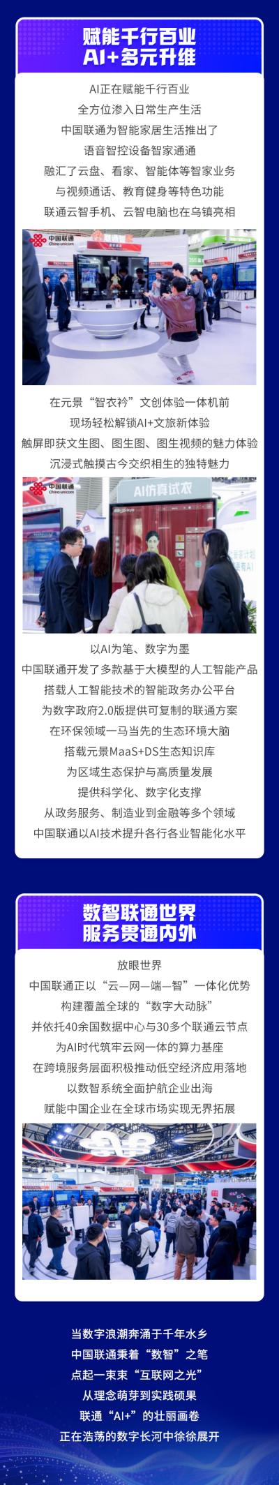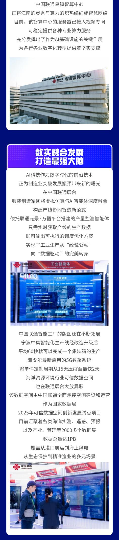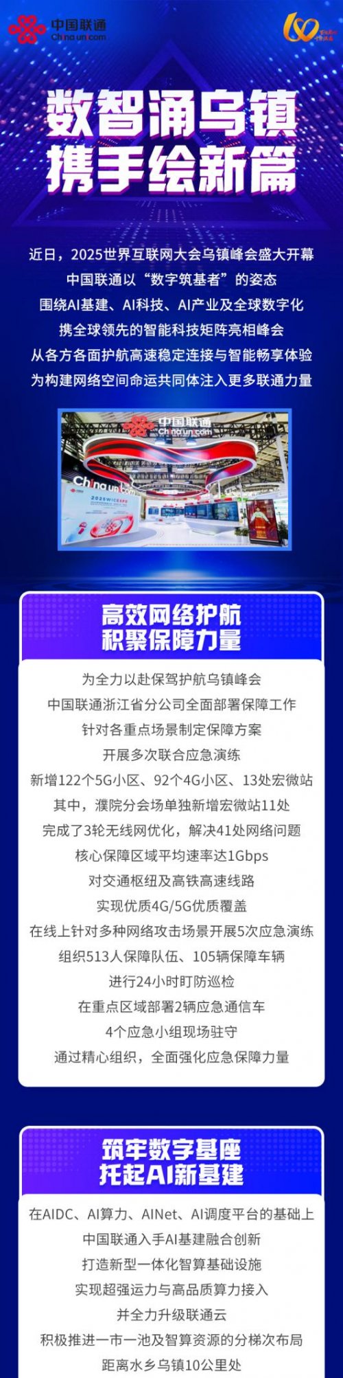 在2025世界互联网大会乌镇峰会,中国联通以“数字筑基者”的姿态,围绕AI基建、AI科技、AI产业及全球数字化携全球领先的智能科技矩阵亮相峰会,从各方各面护航高速稳定连接与智能畅享体验,为构建网络空间命运共同体注入更多联通力量。