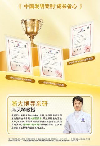 冯凤琴教授团队专注于食品工程与营养研究,团队发现鸡蛋蛋黄中的核心营养,通过特定的专利生物酶解技术,可转化为易吸收的水解蛋黄粉,并释放关键生物活性成分。妙可蓝多研发团队与冯凤琴教授合作,将这些理论研究应用于“捷捷高”产品中,共同探索针对儿童成长的靶向营养支持方案。相关技术已获得三项中国发明专利认证(专利号:ZL202411785270.8、ZL202411785269.5、ZL202311268338.0),并作为“专研添骨俐®成长因子”的重要组成部分,与骨胶原蛋白肽协同作用,助力锁钙与骨骼发育。