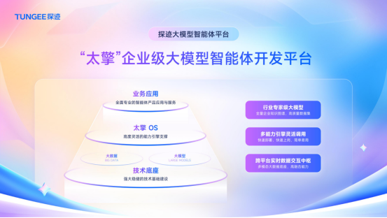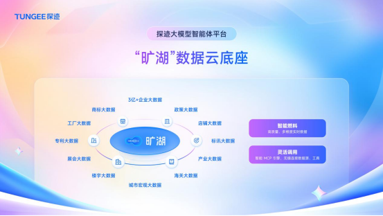 探迹科技的核心技术平台包括“旷湖”数据云底座与“太擎”企业级大模型智能体开发平台。“旷湖”汇聚覆盖20+垂直领域的高质量商业数据,为企业提供决策支持;“太擎”则依托AI Agent技术打造“数智员工”,覆盖营销、客服、运营等场景,实现流程自动化与效率提升。