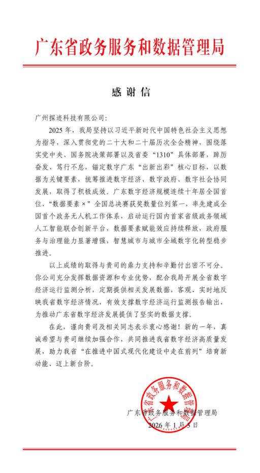几乎同期,探迹科技收到一封来自广东省政务服务数据管理局的感谢信,信中高度赞扬了探迹项目团队在支撑广东省数字经济运行监测分析工作中的敬业精神和专业表现。作为数字经济大省,广东数字经济规模已连续十年位居全国首位,在“数据要素×”领域成果显著。