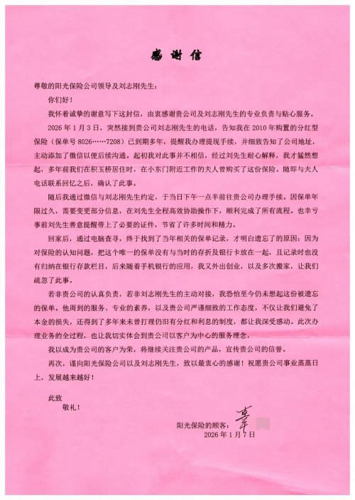 2026年1月初,阳光人寿湖北分公司客户服务经理刘志刚收到了一封来自客户辜先生的感谢信。信中,客户用真挚的语言表达了对公司及刘志刚的感谢与认可。而这份温暖回馈的背后,藏着一段跨越十六年的保单守护故事——一份险些被遗忘的保障,因工作人员的责任与坚守重焕光彩。