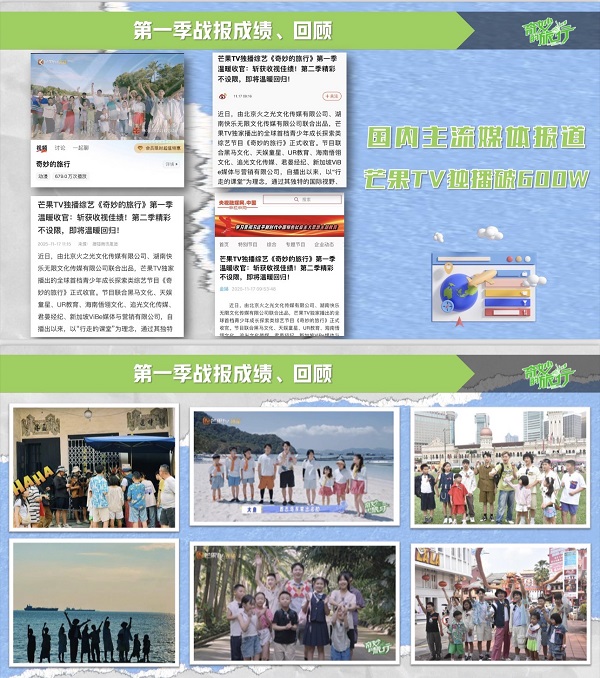 由北京火之光文化传媒有限公司、湖南快乐无限文化传媒有限公司联合出品,芒果TV独家播出的《奇妙的旅行》,是一档以“行走的课堂”为独特理念的全球首档青少年成长探索类节目。节目通过真实记录孩子们在旅途中的体验、挑战与感悟,在广阔的天地间呈现生动而深刻的成长故事。其第一季节目在芒果TV播出期间,全网累计播放量突破600万次,收视与口碑双丰收,成功打造了具有广泛影响力的“行走中的成长课堂”模式。