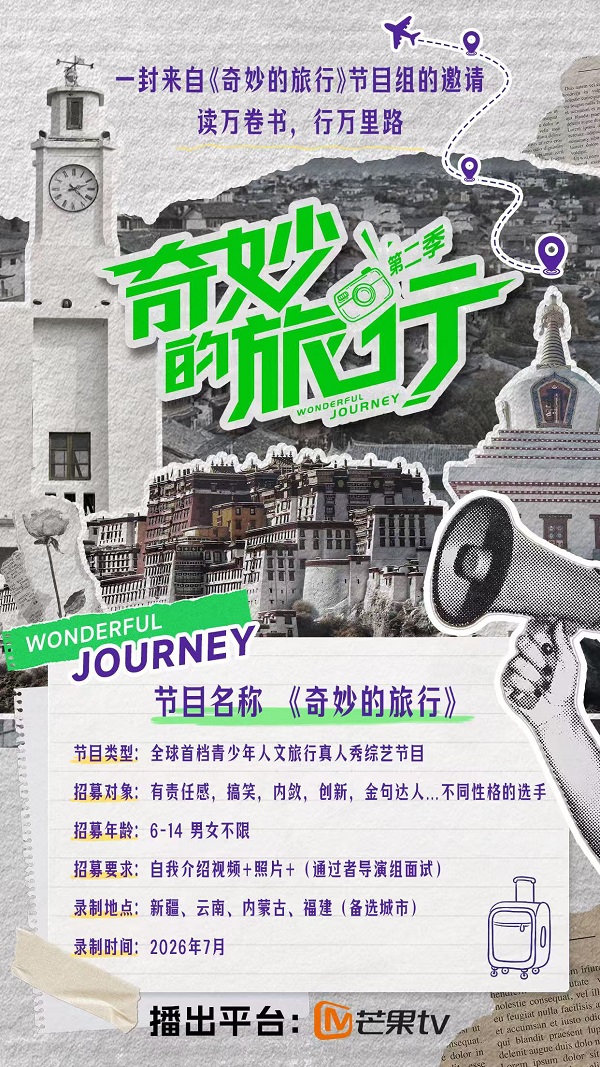 《奇妙的旅行》第二季现面向全国青少年开放报名。节目旨在寻找年龄在6至16岁之间,具有敏锐感知力、独立思考能力和良好团队意识的参与者。在沉浸式成长环境中,孩子们将通过结构化任务提升综合素养,在多元文化场景中拓展认知边界,收获一段兼具教育意义与成长价值的独特经历。