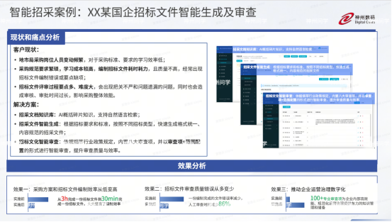 - 优势:一键生成标准化招采文档,30分钟完成从撰写到审查,其中人工审阅时间减少86%以上,内置超100个专业审查项,支持全私域部署