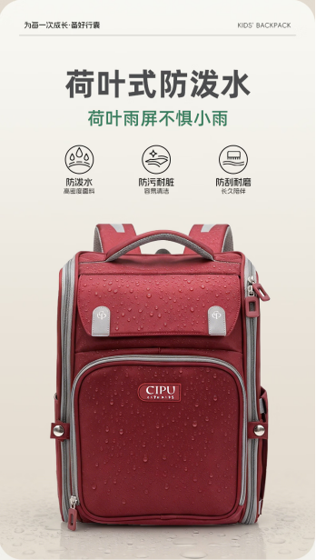 不仅如此,CIPU书包采用荷叶式防泼水面料,具备防污、耐刮、易清洁特性,雨天出行更安心;内部设有前置文具袋、暗磁插袋、多层分区收纳,满足日常学习需求。