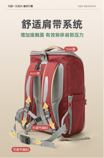 以我家孩子现在背的M号趣满分系列为例,身高130cm到150cm的孩子都适合。自重925g,容量18L,可完全放平的一片式结构设计,支持拆卸清洗,卫生维护更便捷。 肩带系统宽达6cm、厚1cm,内置高弹缓冲层,并配备了磁吸式的可调节胸扣与腰扣,形成“5重锁定”动态贴合系统:从双肩、胸椎到腰椎层层减压,跑跳亦稳固。