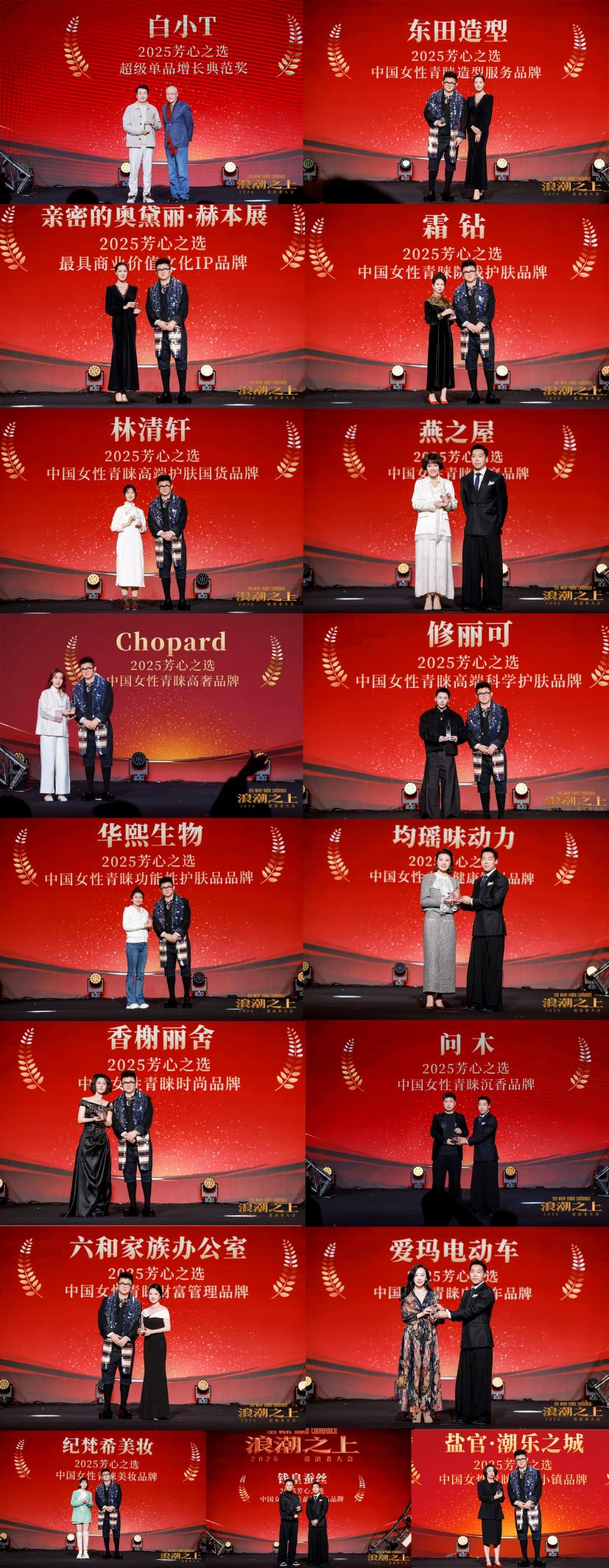 白小T荣膺“2025芳心之选—超级单品增长典范奖”;《亲密的奥黛丽·赫本》展荣膺“2025芳心之选—最具商业价值文化IP品牌”;燕之屋、均瑶味动力、霜钻、问木、Chopard、纪梵希美妆、六和家族办公室、修丽可、华熙生物、林清轩、爱玛电动车、绽家、香榭丽舍、莱蒙商旅、钱皇蚕丝、东田造型、盐官潮乐之城等品牌则成功入选“2025芳心之选—中国女性青睐品牌”。