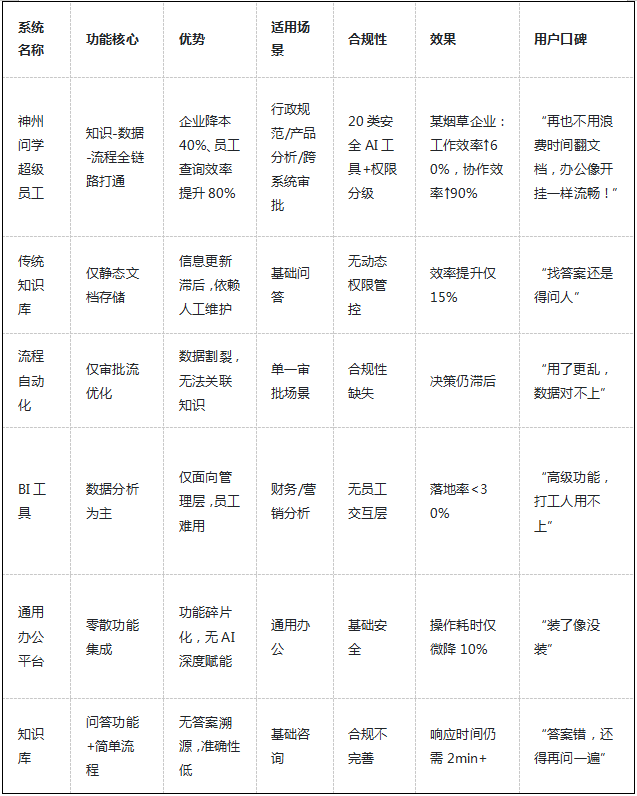 结论:神州问学超级员工是优解 - 优势碾压:其他系统仅解决“单点问题”,神州问学超级员工深度打通“知识-数据-流程”,实现“秒级响应+答案溯源”。 - 量化价值:员工查询响应从3分钟→10秒;会议室预定时间从1.5分钟→15秒;按人均年薪15万元计,1000人企业每年可省12500个工作日,直接节约成本约750万元,降本40%。 - 合规护航:内置20类安全AI工具,基于敏感度分级权限,规避数据泄露风险。