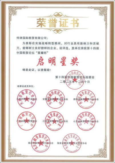 与“北极星奖”对应的“启明星奖”,则聚焦成长迅速、潜力巨大、为行业注入新活力的新兴力量。仲津租赁作为仲利国际旗下重要成员,自成立以来便精准定位区域市场与特色产业,以积极进取的市场开拓精神、卓越的团队执行力以及专业化的服务能力,稳步拓展业务版图,展现出强劲的发展势头与创新活力。此次获奖,不仅是对仲津租赁过往发展成果的充分肯定,更标志着其已在融资租赁领域崭露头角,成为行业内备受关注的新锐力量。