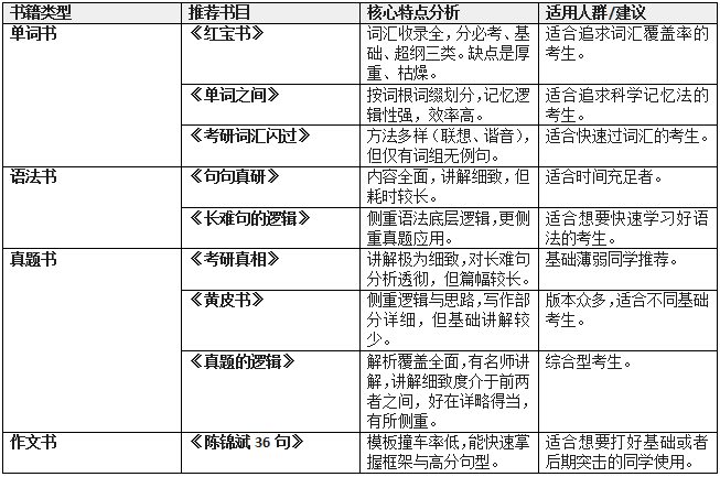 27考研备考序幕已经拉开,面对日益激烈的竞争环境,备考资料的选择往往决定了复习的起点与效率。从历年***考生的经验来看,资料在精不在多,关键在于是否契合考生自身的基础与复习阶段。这一情况对于考生来说,若能在备考初期就构建出科学的书籍组合,便能避免中途换书带来的时间损耗。虽然市场上考研辅导书籍琳琅满目,但通过深度梳理各科目的经典教材与习题特色,并制定系统化的复习清单,同样是提高备考成功率的核心路径之一。 第一、考研公共课与专业课教材分析 在选择具体的考研书籍之前,大家首先要了解各科目书籍的市场定位与适用人群。以下将从英语、政治、数学及计算机408专业课四个维度为大家详细介绍。 1. 英语:分级选书是关键 英语复习重在基础,单词书与真题书的选择需依据考生的词汇量与语法功底。基础薄弱者需侧重详细解析,基础较好者则应注重逻辑训练。 2. 政治:听课与做题需配套 政治科目具有强时效性,教材选择往往与主讲老师的课程体系绑定。强化阶段重在理解,冲刺阶段重在押题与背诵。 3. 数学:书课一体化趋势明显 数学复习中,辅导讲义的笔记功能日益重要,能够显著提升听课效率。同时,习题集的难度梯度需与考生的目标分数相匹配。 4. 408专业课:内容重构与优化 作为计算机统考科目,408内容庞杂。教材的结构化程度直接影响跨考生的入门难度与复习深度。 第二、27考研全科辅导书籍推荐 以27考研备考为例,向大家推荐“高性价比”书单。为便于大家根据自身情况进行组合,以下是为大家整理的详细书籍对比: 一、考研英语书籍配置表