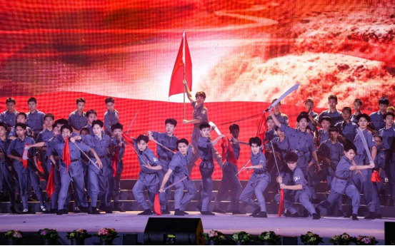 晚会伊始,学校交响乐团以《十送红军》《没有共产党就没有新中国》奏响序曲,恢弘音浪瞬间将全场带入波澜壮阔的历史岁月。郑春总校长在致辞中强调,晚会以“为党育人、为国育才”为初心,通过沉浸式艺术教育让师生感悟“家国”分量,自觉将个人理想融入民族复兴征程。他回顾学校过去一年取得的中高考亮眼成绩、千余项获奖荣誉及素质教育成果,并重点阐述了“少年科学院”设立、顶尖高校协同育人等拔尖创新人才培养布局,展现了学校立足侨乡、争创省一流名校的坚定信心。 文艺演出环节,16个节目轮番登场,涵盖舞台剧、舞蹈、合唱、器乐演奏、朗诵、武术、音乐剧、粤语童谣、艺术体操、情景剧等多种形式。从“山河铸魂”篇章的《华夏一统》《甲骨玄文》《诗经·蒹葭》到“文脉千年”的《四季·长风》《梦幻敦煌》《兰亭韵》,从“烽火淬炼”的《南京照相馆》《为胜利而战》《薪火》到“同心筑梦”的《校园的早晨》《少年广雅说》《新时代答卷》,师生们纵贯古今,生动演绎了从文明初曙、汉唐风韵到新时代征程的壮丽画卷。当《没有共产党就没有新中国》旋律响起,全场万人肃立齐唱,挥舞的小国旗汇聚成“红色海洋”,将晚会推向情感巅峰。