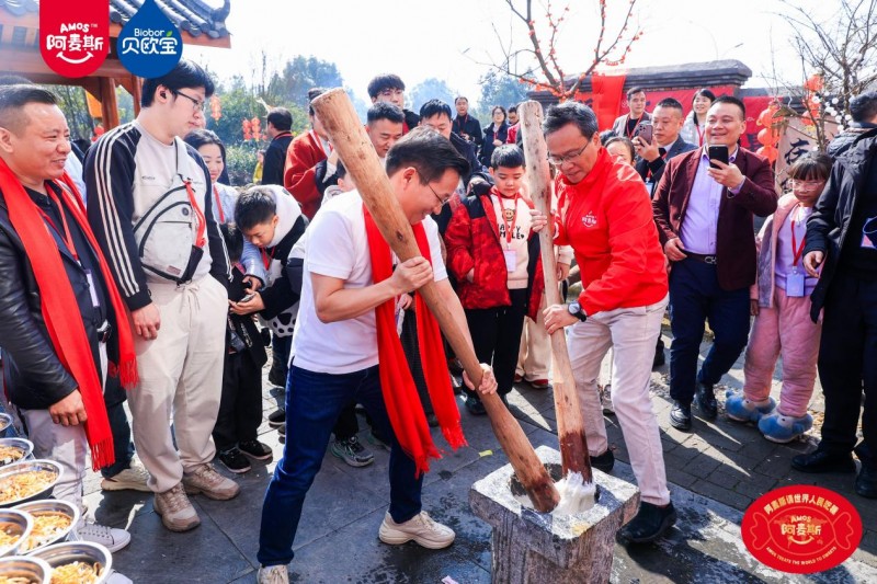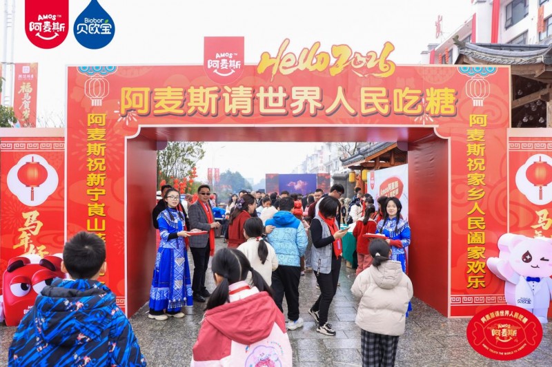 (金多多食品集团董事长、“糖果叔叔”马恩多体验打糍粑等民俗活动) 走进崀山景区北大门,“Amos阿麦斯请世界人民吃糖” “糖果叔叔请家乡人民吃糖”等巨幅标语格外亮眼,Amos阿麦斯、Biobor贝欧宝两大品牌特色打卡装置,与大红灯笼、中国结等新春元素交相辉映,迅速成为家乡人民及游客春节热门打卡点。景区游客中心、核心路段等多处电子大屏,循环播放着马恩多先生的新春祝福与诚挚邀约,言语间满是在外游子对家乡发展的牵挂与期许。“Amos阿麦斯请世界人民吃糖之崀山站”,作为金多多食品集团2026全球品牌战略落地的重要一站,不仅将品牌全球战略与桑梓深情紧密相连,更让每一位乡亲与游客都能感受到“从崀山走向世界,以甜蜜回馈崀山”的品牌情怀。