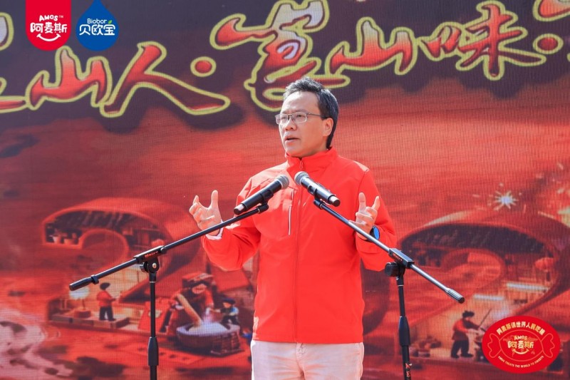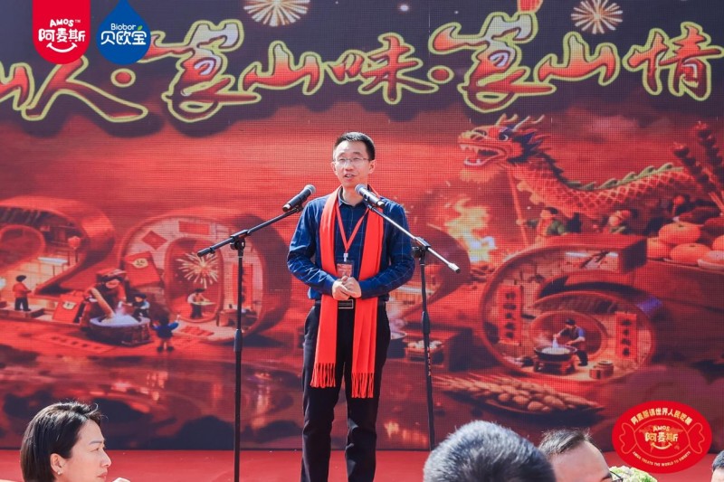 (深圳市湖南新宁商会会长、金多多食品集团董事长、Amos阿麦斯品牌创始人马恩多致辞) 作为本次活动重要参与方代表,金多多食品集团董事长马恩多上台致辞。他向精心筹备本次“崀山过大年”活动的新宁县委、县政府,向所有为家乡发展默默付出的建设者,向此刻欢聚一堂的父老乡亲们,表示衷心的感谢,并欢迎大家来崀山吃糖!他说到:“我们生于新宁,长于斯土。夫夷江是母亲河,滋养血脉;崀山是精神峰,铸就脊梁。金多多食品集团的企业使命是做世界的甜蜜使者,2026年全球品牌推广主题是“Amos阿麦斯请世界人民吃糖”。我们相继在北京请奥运冠军吃糖,在内蒙古冰雪草原,请蒙古人民吃糖,在洛杉矶请格莱美歌星吃糖,在米兰冬奥会,请体育记者和冬奥冠军、意大利小朋友吃糖,现在特别高兴我们回到美丽的新宁崀山,请家乡人民吃糖。!”他同时宣布,金多多食品集团将启动 “为新宁人民送一吨糖” 春节公益行动。送糖行动由新宁县销售团队全程执行,将甜蜜礼包陆续送到全县群众手中,以实实在在的暖心举措,诠释企业与家乡人民共欢庆、同发展的深厚情谊。
