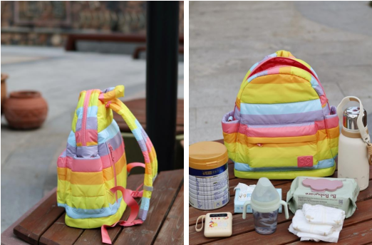 我买的是双肩款彩虹包,容量够大但很轻盈,颜值也非常高。最打动我的是它的分区逻辑:湿巾、奶瓶放在侧边口袋,单手一拉就出来;主袋里面空间较大,放得下奶粉分装盒、辅食等必备品,若干小口袋还能妥善放置安抚巾、小玩具等物品;小物件像钥匙、唇膏可以放在外侧拉链袋,不用在包里翻半天。以前带娃去公园,光找湿巾就得腾出一只手找半天,现在轻松多了。