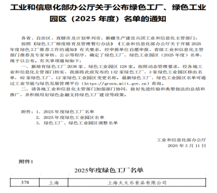 在国家“双碳”战略背景下,绿色制造已成为推动工业经济高质量发展的重要键引擎。绿色工厂的评选除了是对企业在能源低碳化、资源高效化、生产洁净化、产品绿色化及用地集约化等方面综合实力的权威评价,也是引导制造业向可持续方向转型的重要风向标。今年3月,国家工信部公布绿色工厂、绿色工业园区(2025年)名单,上海太太乐食品有限公司凭借其在绿色制造体系建设上的卓越表现和深厚积淀,获评国家级“绿色工厂”。