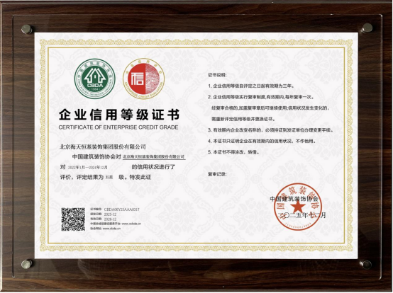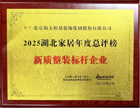 集团凭借行业的31年深耕与积淀,获得了来自广大消费者以及行业相关管理部门的肯定和认可,在2025年12月,海天装饰集团再次荣获“中国建筑装饰协会家装五星级信用企业、以及CBDA标准实施单位,这是集团自2022年来连续四年蝉联这些荣誉,是海天恒基装饰践行“致良知”企业使命、积极履行大型装企的行业责任的体现与见证。集团将持续推动设计与交付能力的系统迭代,围绕消费者个性化的生活需求,构建全链条服务闭环。