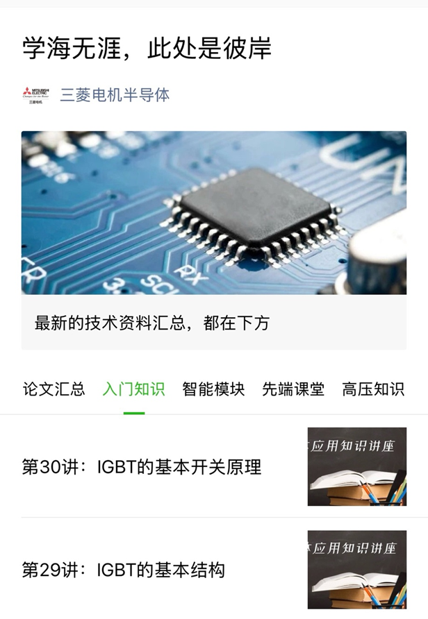 进入【PCIM电力电子新世代】公众号,菜单栏点击【PA干货库】即可加入 其核心价值在于“官方筛选”与“体系化”。首批上线的展商技术知识,均由PCIM Asia展会顾问把关筛选并推荐收录,确保资料的权威性与实用性,覆盖从半导体物理基础、器件原理到系统设计、热管理、可靠性验证等全链路知识。 头部厂商入驻,构建完整学习路径 目前,知识库已经收录了三菱电机、英飞凌、赛米控丹佛斯、安世半导体、罗姆、安森美等国际领先企业的技术资料,更多PCIM Asia合作展商技术资料正在筛选入库中。 • 三菱电机的技术文库分为“入门知识”、“智能模块”、“高压知识”、“先端课堂”和“论文汇总”五大板块,从IGBT基本原理到SiC MOSFET前沿应用,构建了循序渐进的学习阶梯。
